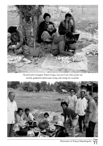 Noted textile designer, Pensri Sanga, (second from left) points out freshly gathered mushrooms being sold along the roadside. Page Memories of Prinya Wanchupela 71