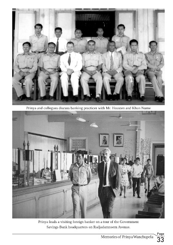 Prinya and collegues discuss banking practices with Mr. Housten and Khun Nume Prinya leads a visiting foreign banker on a tour of the Government Savings Bank headquarters on Radjadamnoern Avenue. Page Memories of Prinya Wanchupela 33