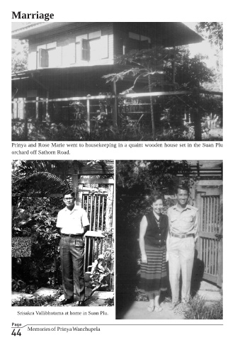 Marriage Prinya and Rose Marie went to housekeeping in a quaint wooden house set in the Suan Plu orchard off Sathorn Road. Srisakra Vallibhotama at home in Suan Plu. Page 44 Memories of Prinya Wanchupela